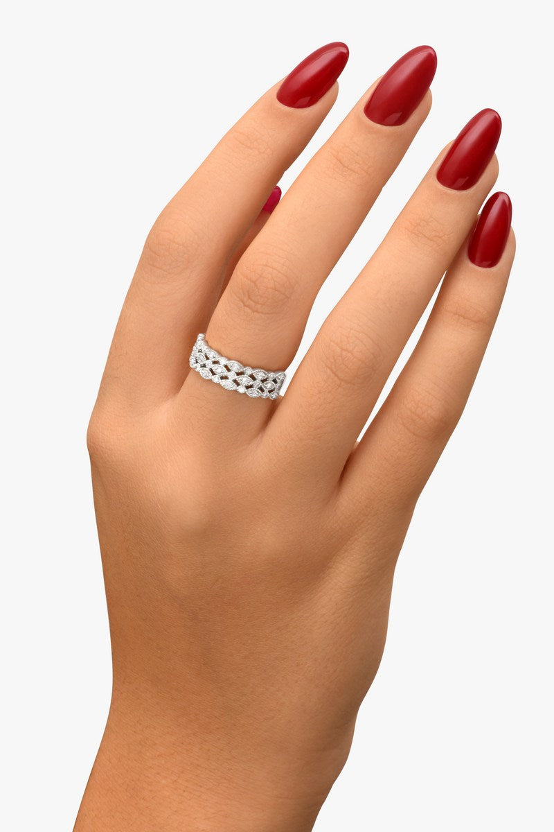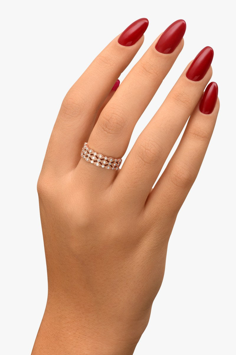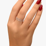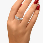 La bague Hannah, une fusion parfaite entre géométrie et élégance, présente trois rangées de diamants alternant grappes