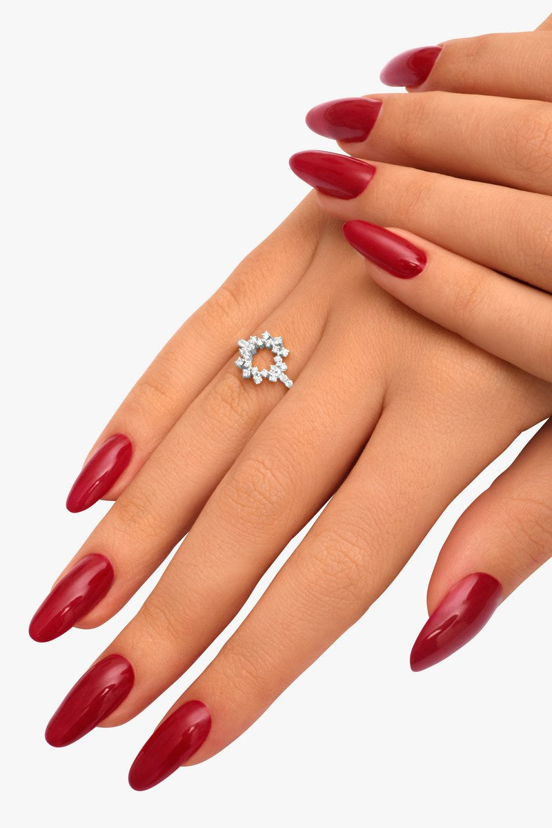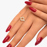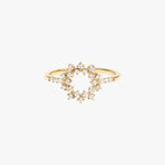 Évoquant un soleil, la bague Inès s’illustre par un motif central ajouré, délicatement composé de diamants étincelants. Les pierres, disposées en étoile rayonnante, créent un jeu de brillance aérien et raffiné.