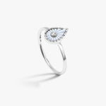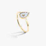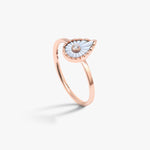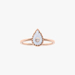 Myrtho est une bague délicate qui met en valeur une petite goutte de nacre, ciselée à la main par un joaillier, finement entourée d’un contour texturé et éclairée en son centre par un diamant naturel.