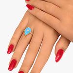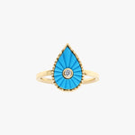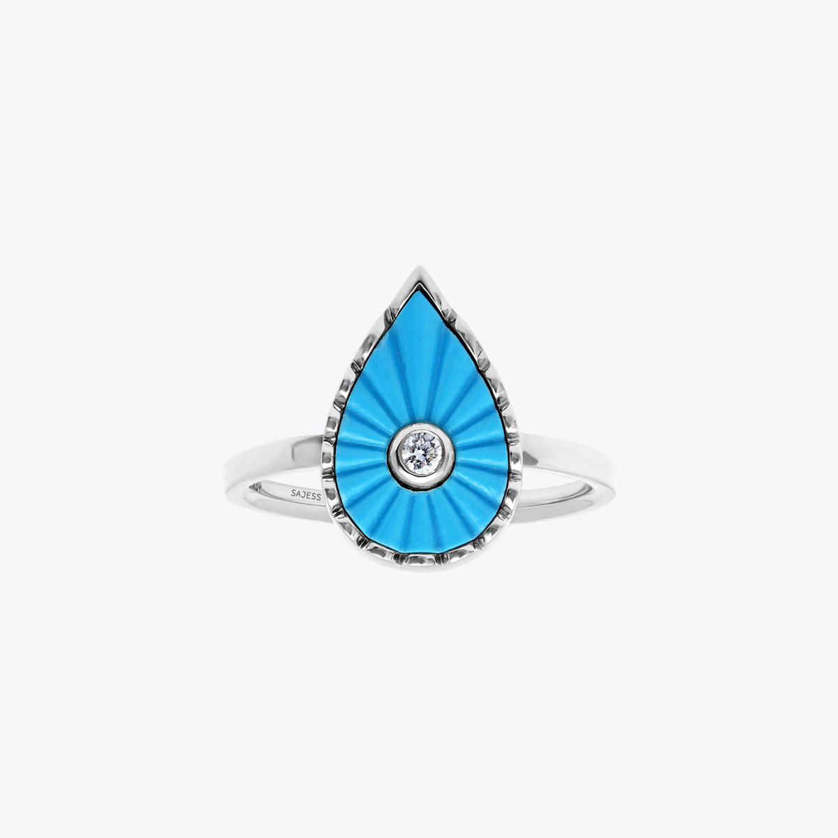 Élégante et délicate, la bague Martine, dans sa version grand modèle, met en valeur l’éclat d’une goutte de turquoise, sculptée à la main par un joaillier, délicatement entourée d’un contour texturé et illuminée en son centre par un diamant naturel.