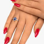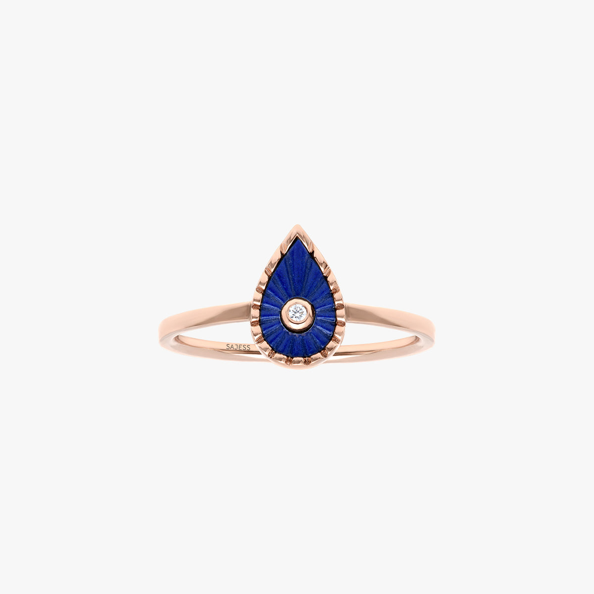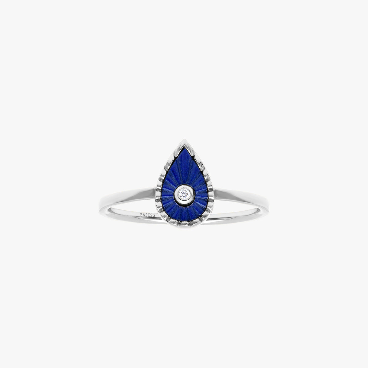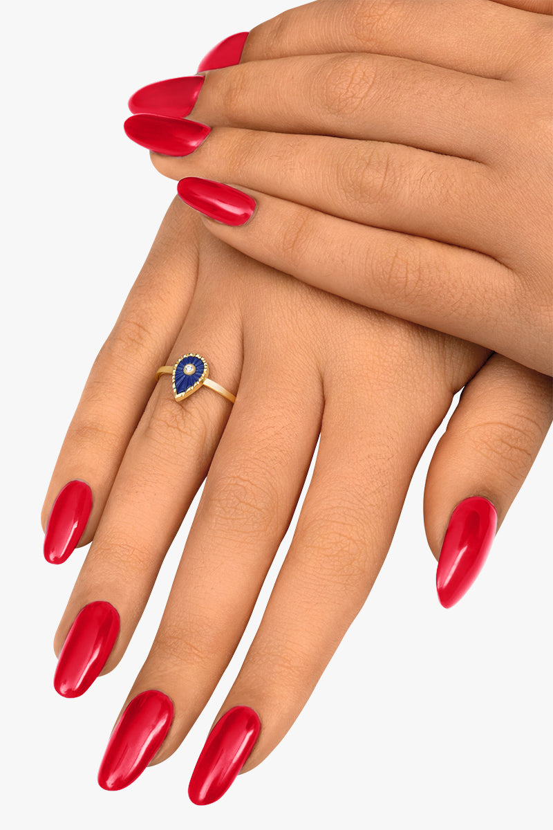 Axana est une bague délicate qui met en valeur une petite goutte de Lapis Lazuli, ciselée à la main par un joaillier, subtilement entourée d’un contour texturé et illuminée par un diamant naturel en son centre.