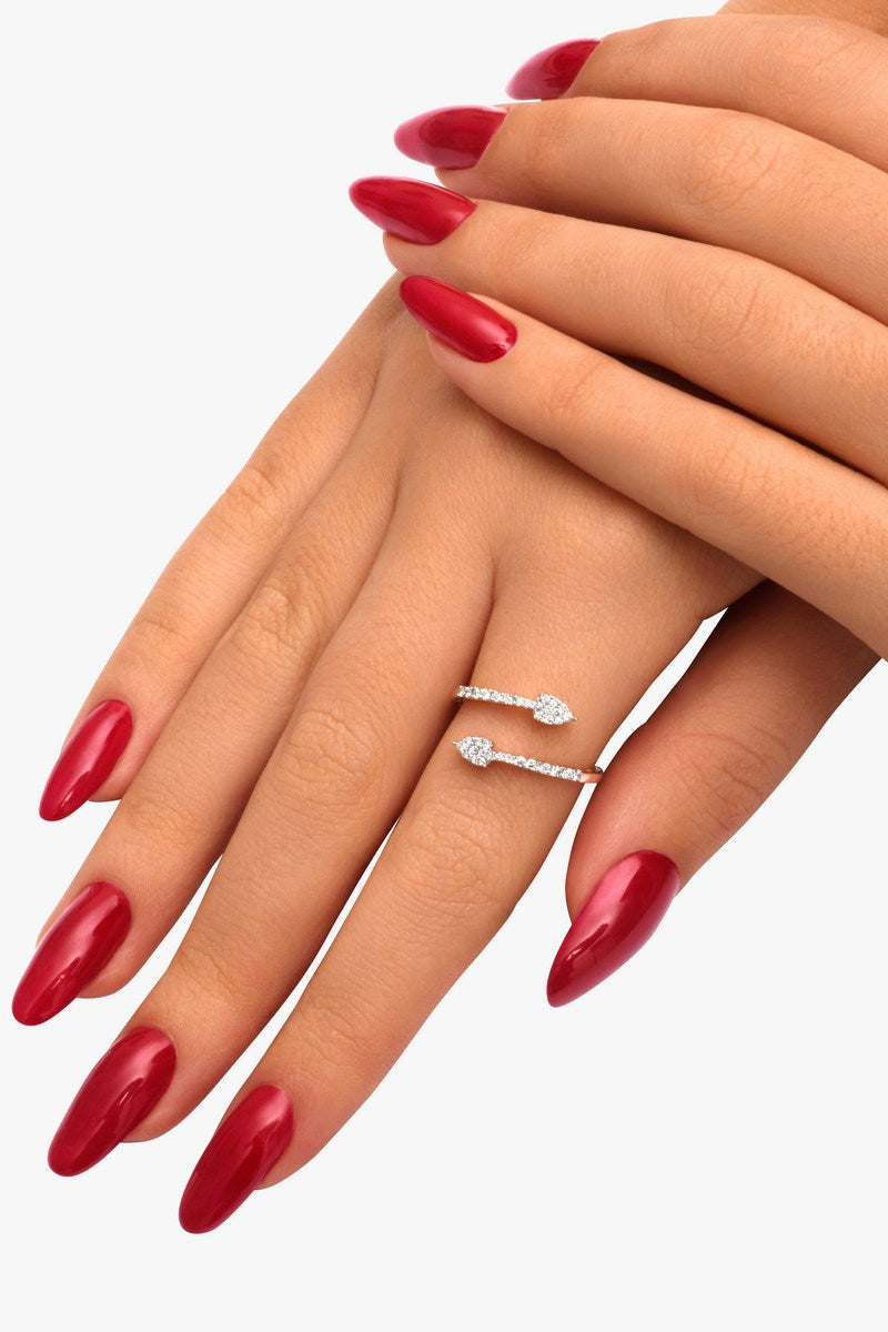 La bague Elena, en or au design ouvert, séduit par son allure graphique et sa brillance éclatante. Pavée de diamants, elle se termine par deux motifs en pointe finement sertis, qui semblent se frôler sans jamais se toucher — un jeu de tension élégante et moderne.