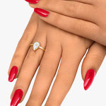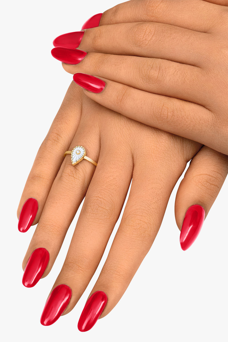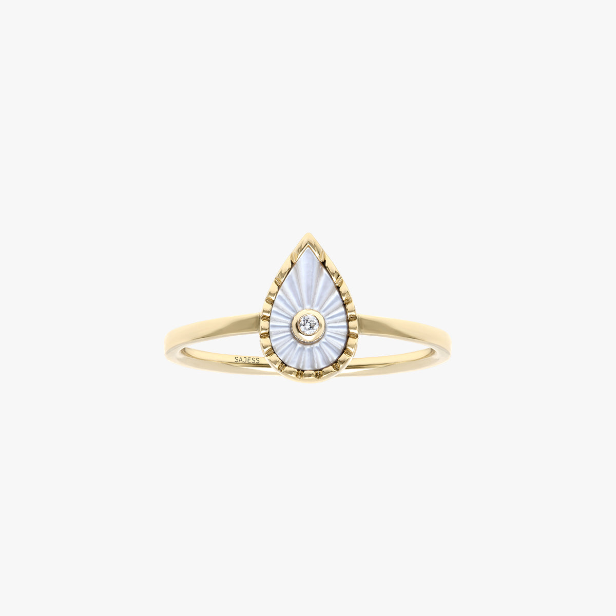 Myrtho est une bague délicate qui met en valeur une petite goutte de nacre, ciselée à la main par un joaillier, finement entourée d’un contour texturé et éclairée en son centre par un diamant naturel.