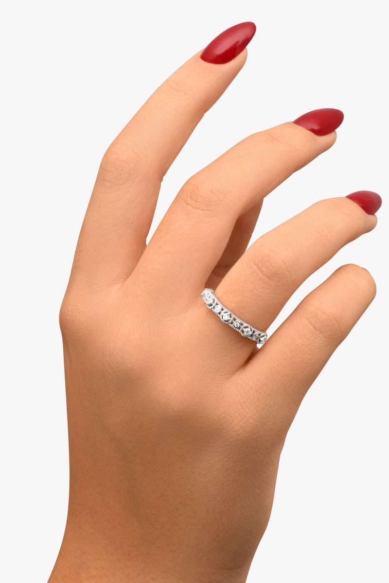Les diamants ronds sont sertis en alternance, chacun entouré d’un contour ciselé finement travaillé, évoquant la délicatesse d’une dentelle ancienne.