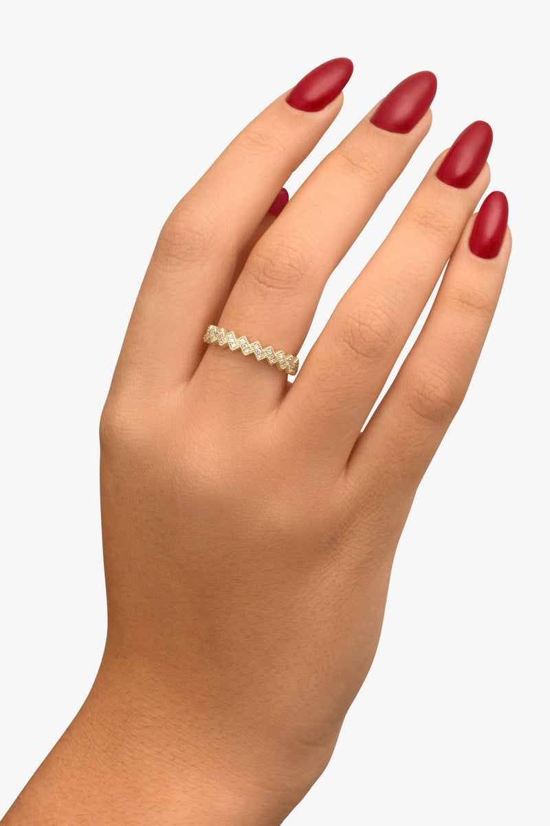 Audacieuse et moderne, la bague Shirley en forme de zigzag joue avec les lignes et la lumière.