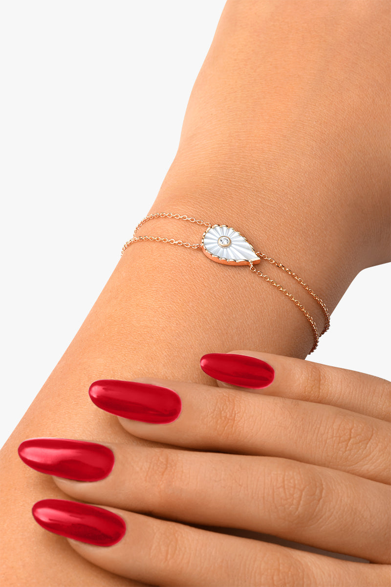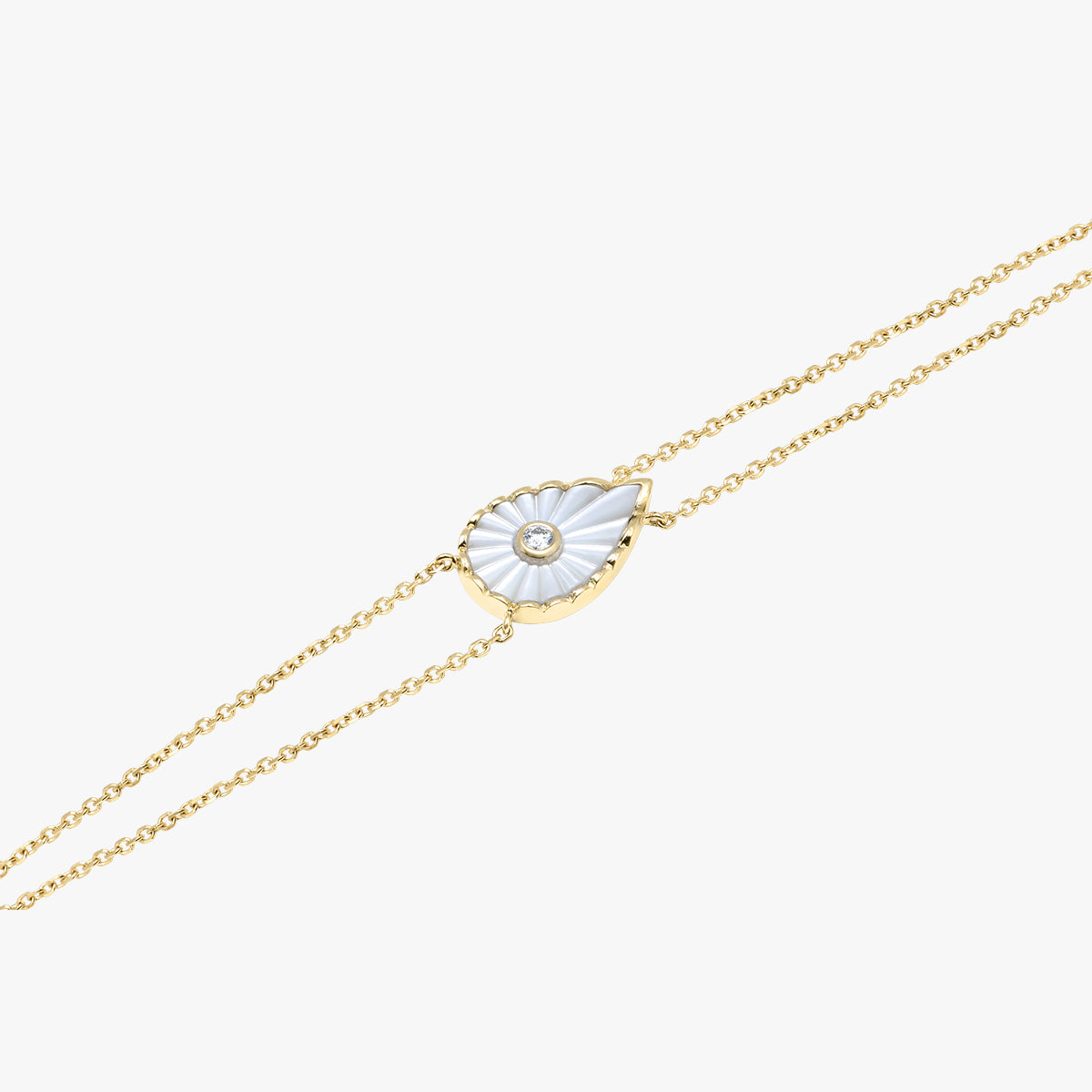 Élégant et lumineux, le grand modèle du bracelet Myrtho met en valeur une goutte de nacre, entourée d’un contour finement texturé.
