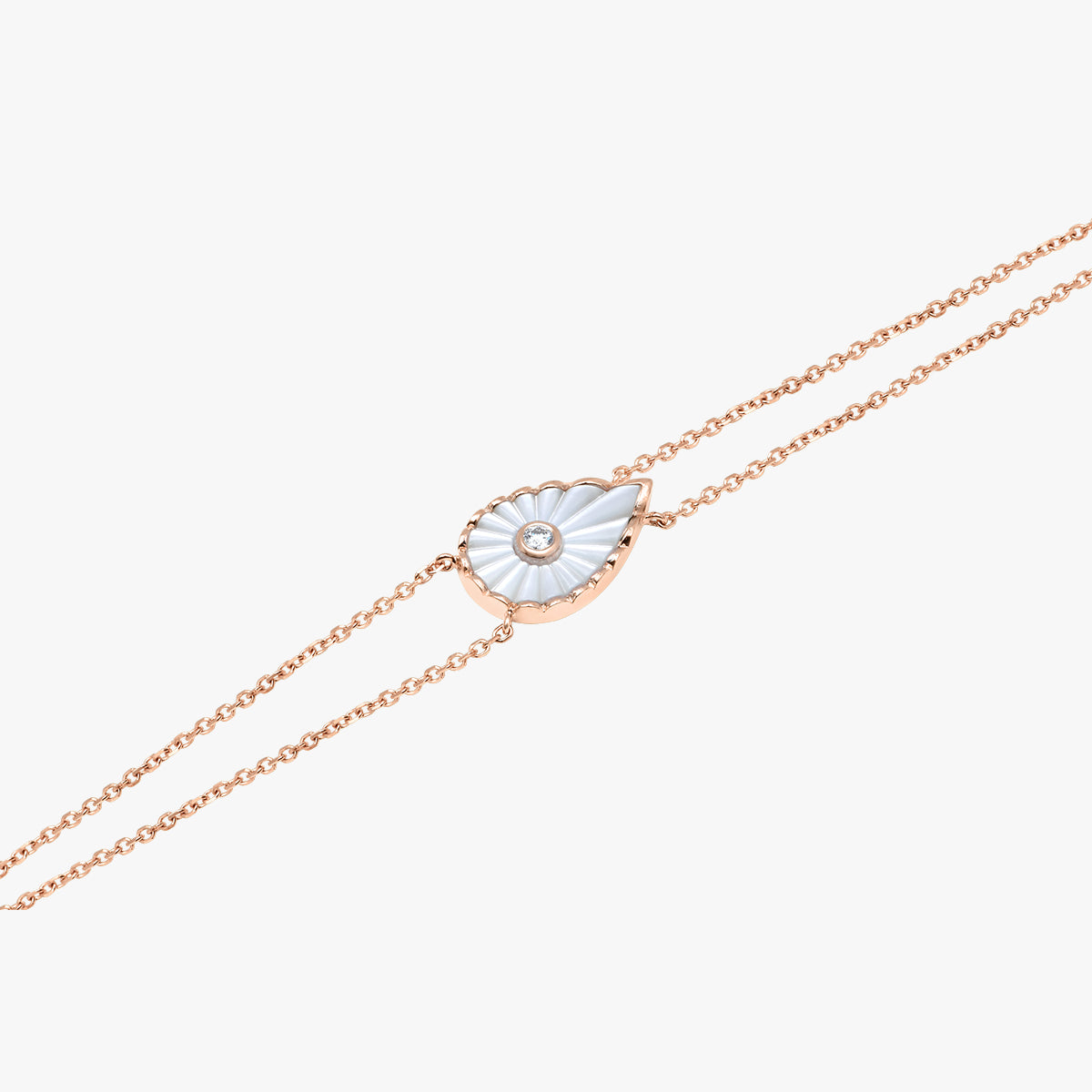 La pierre irisée, éclatante de douceur, est sublimée par le double rang de chaîne, ajoutant une dimension de raffinement.