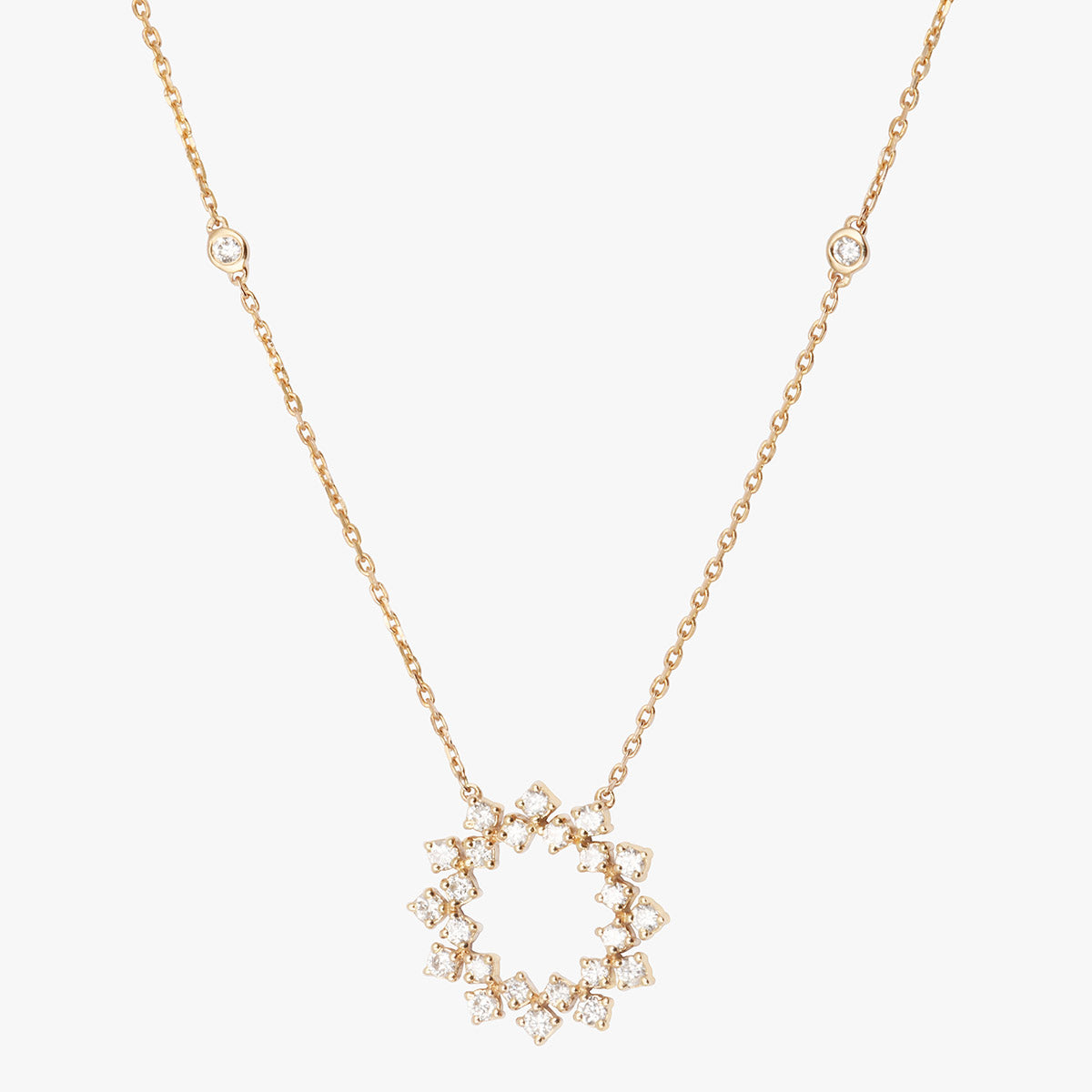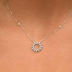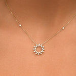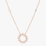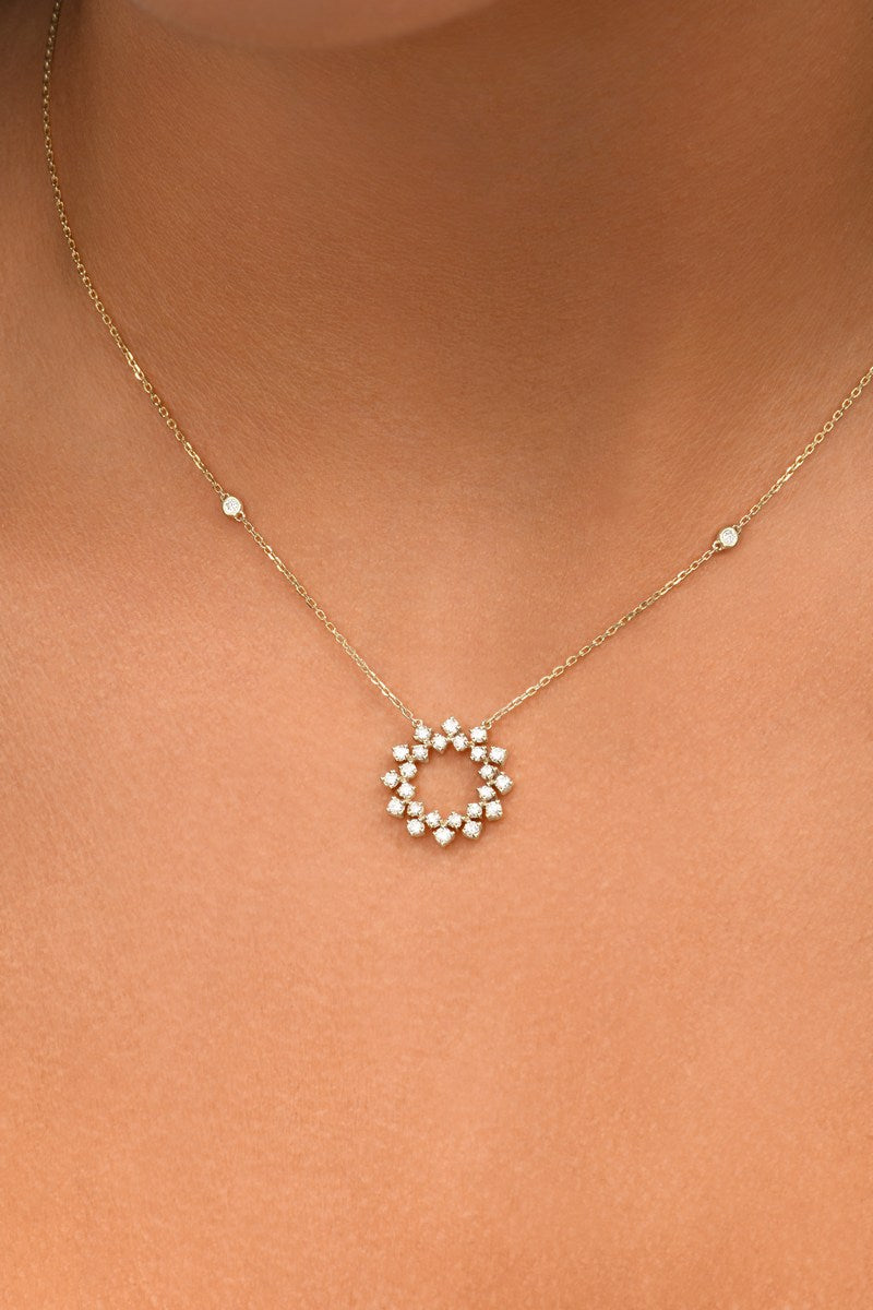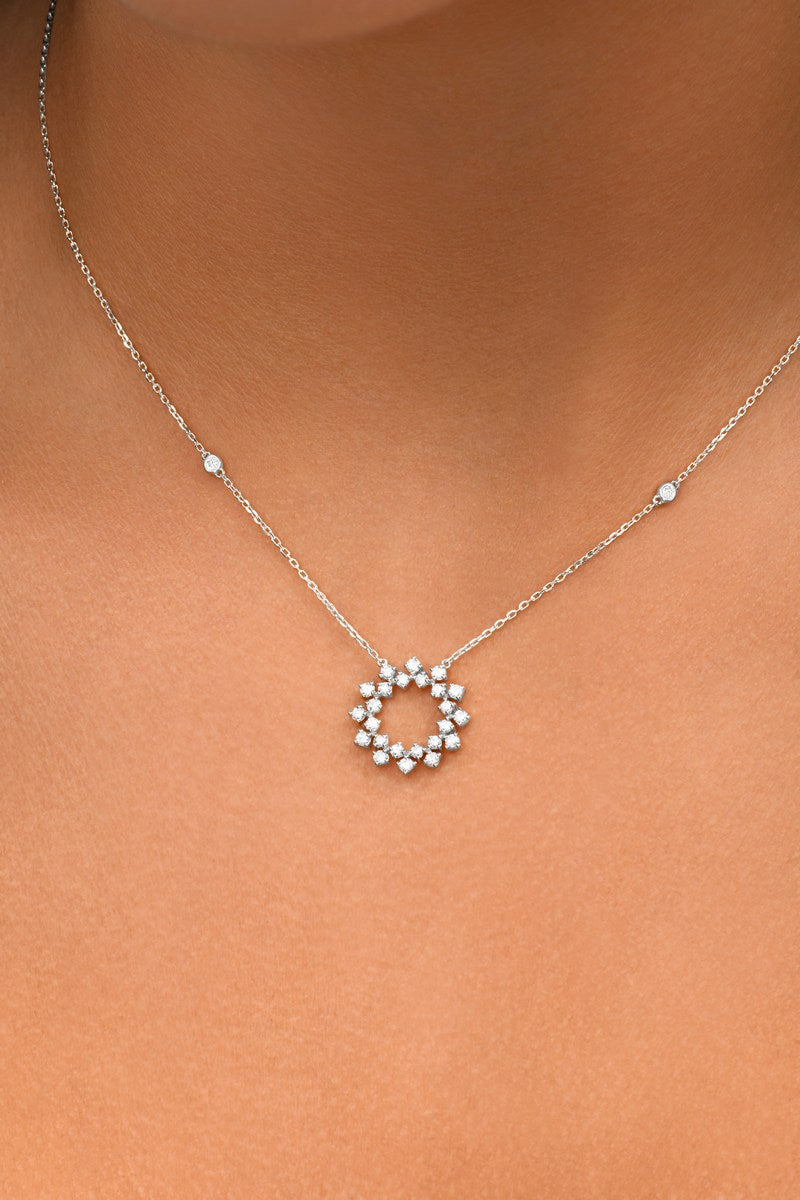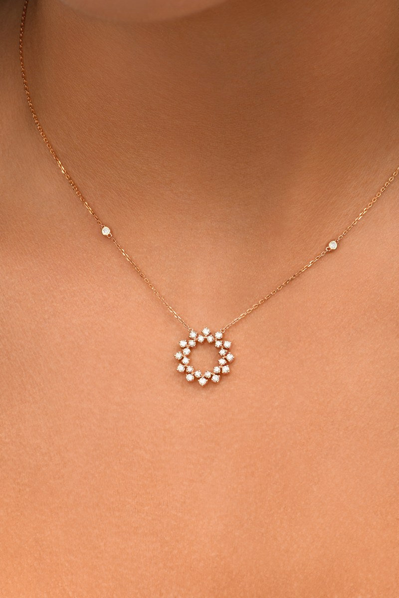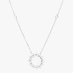 Le collier Inès illumine le décolleté avec une élégance aérienne. Son pendentif central, délicatement ajouré et orné de diamants scintillants, évoque un soleil à la fois graphique et raffiné.