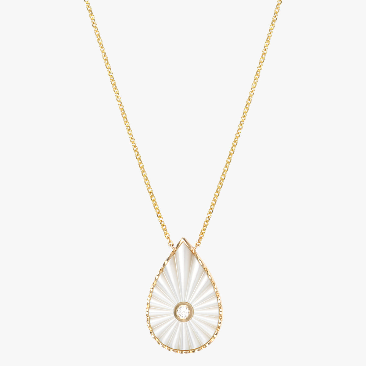 Tout en finesse, le collier Myrtho met à l’honneur une goutte nacrée lumineuse, subtilement irisée, soulignée d’un contour texturé et d’un diamant naturel central.
